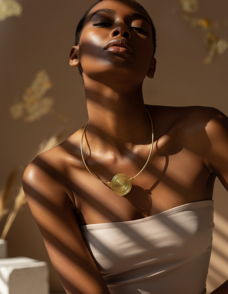 Hand-sculpted in brass with a gold finish, this minimal choker features a spiral motif at the center, symbolizing balance, growth, and energy. Its clean, open-neck design drapes gracefully along the collarbone, merging ancient symbolism with modern sophistication.