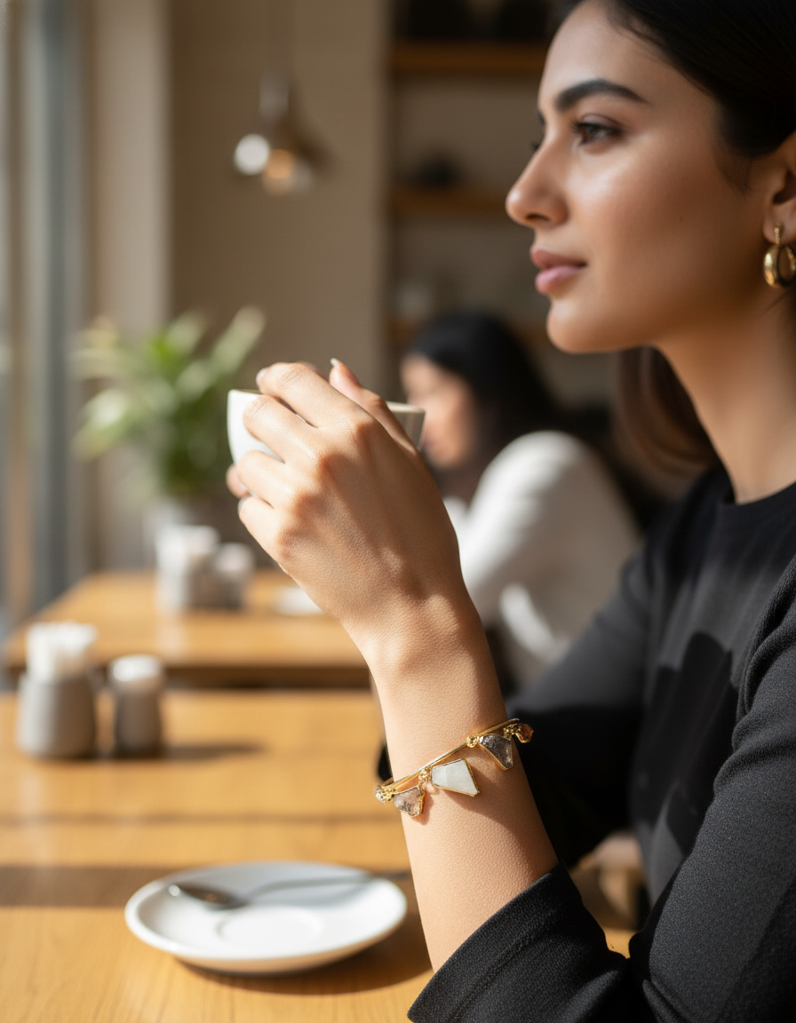 Each bracelet features five hand-selected raw gemstones — uncut, unpolished, and uniquely shaped — set in fine gold-plated bezels. No two stones are ever alike, making each piece a distinct expression of nature’s craftsmanship.